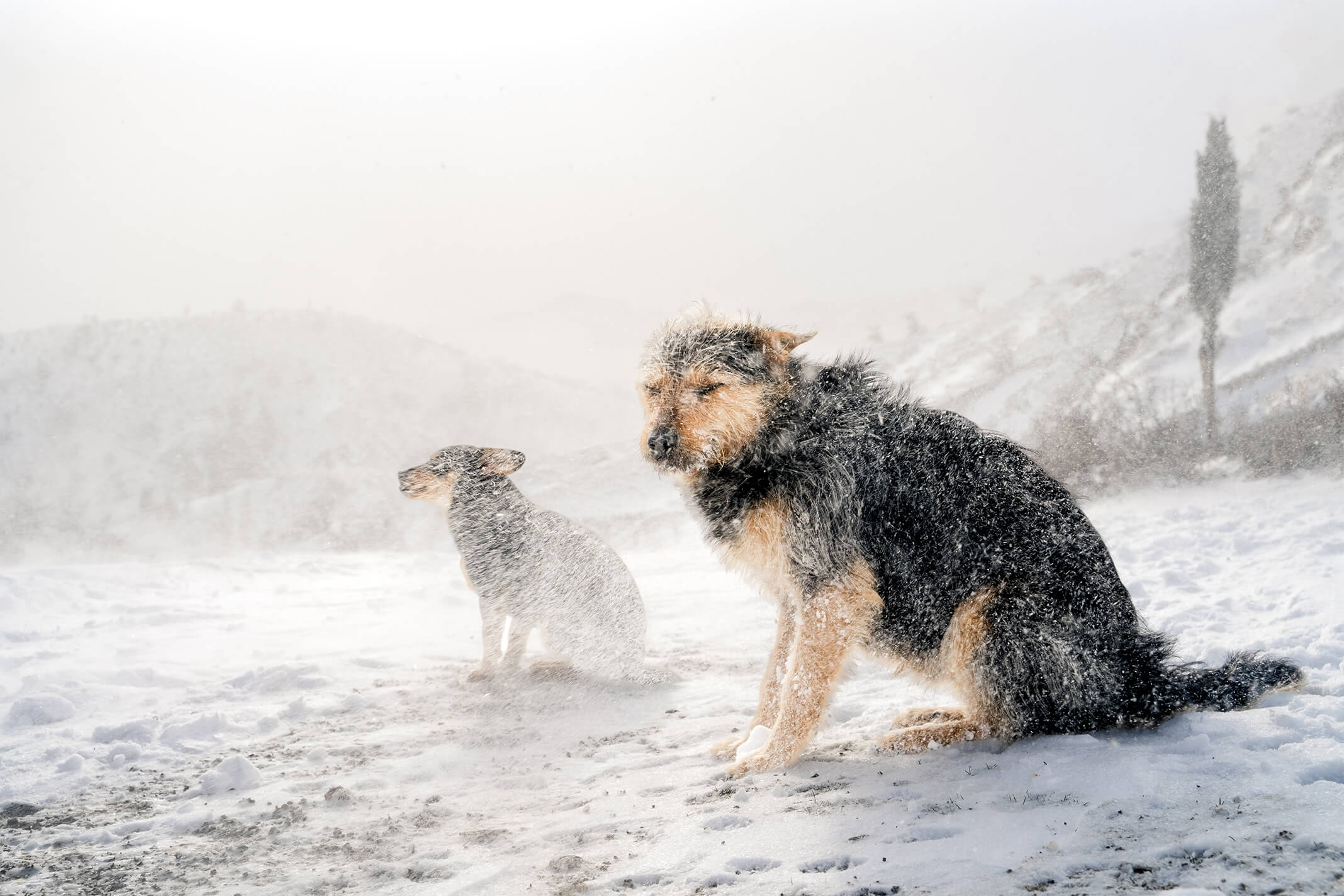Een natte vacht koelt veel sneller af. Dep buik, borst en poten goed droog en verwijder sneeuwklonten uit vacht en tenen. Dit kun je eenvoudig doen door de klontjes tussen je vingers kapot te knijpen.